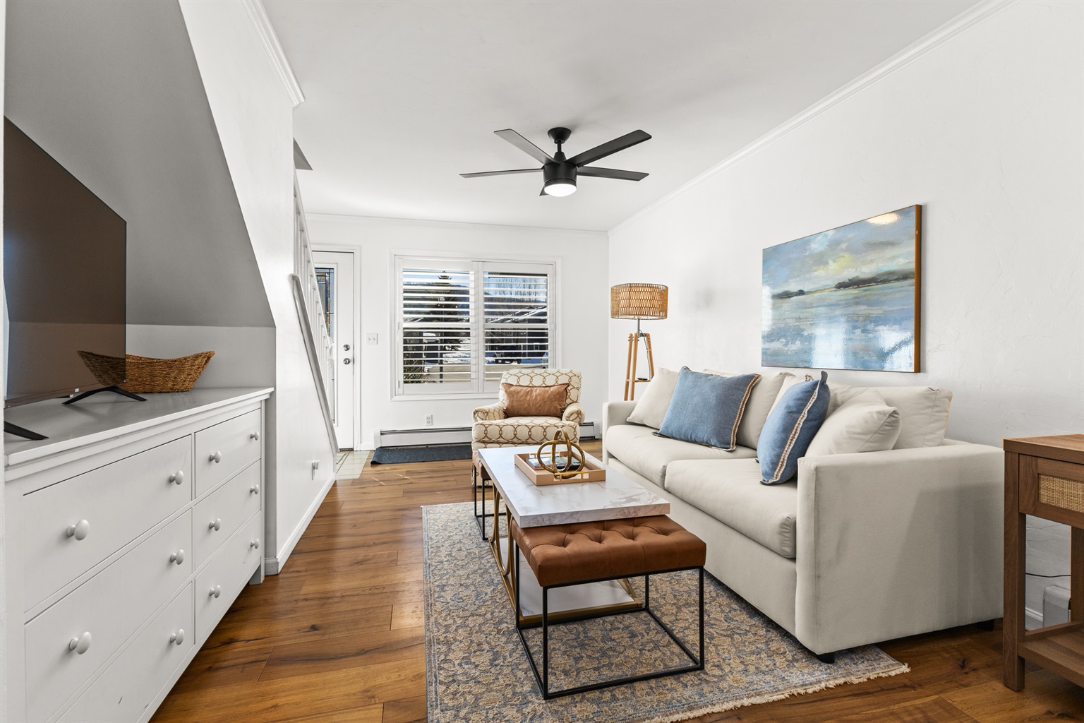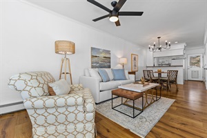 The welcoming living area features comfortable seating, a sleeper sofa for extra guests, and a warm, relaxed atmosphere—ideal after a day on the trails or exploring town. Step outside to enjoy the small fenced yard, perfect for morning coffee or letting your dog stretch their legs.