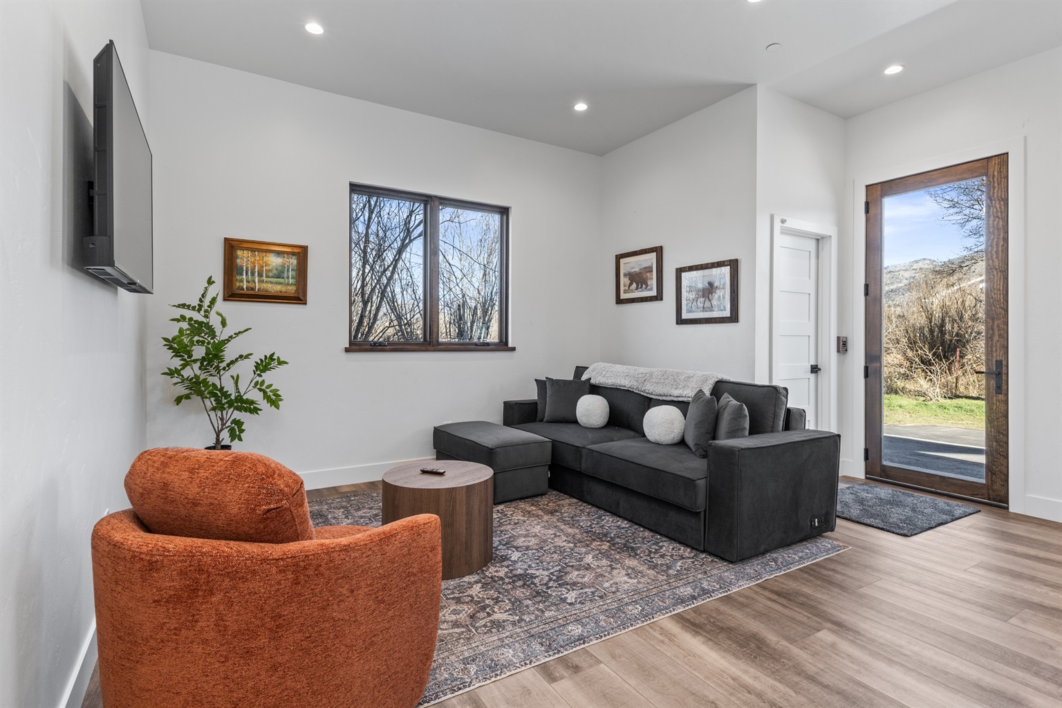 The cozy living area features plush seating, a Smart TV, and mountain views through large picture windows. Step outside to breathe in fresh alpine air or unwind after a day of work or adventure.