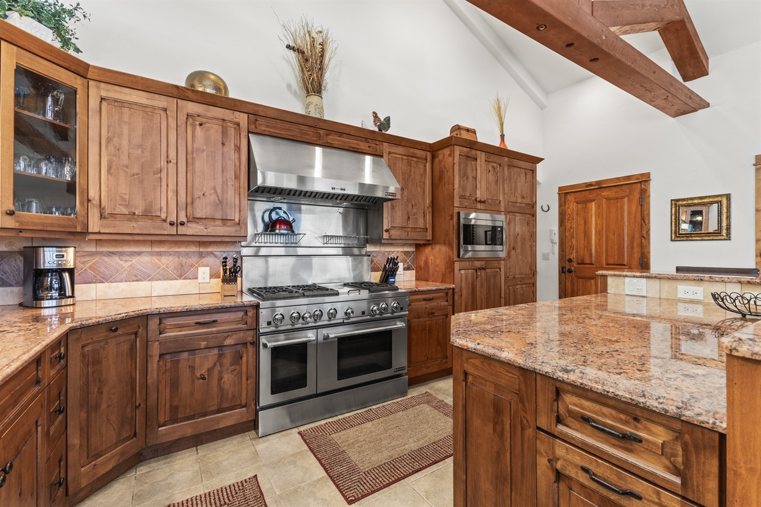Gourmet Kitchen: Equipped with a 6-burner stove, flat top griddle, 2 ovens, and granite countertops, perfect for cooking meals.