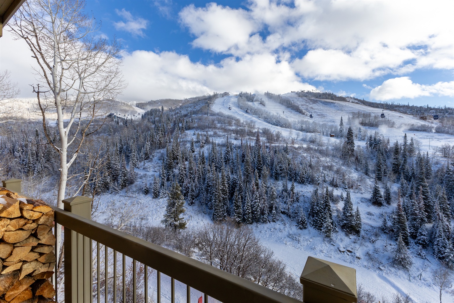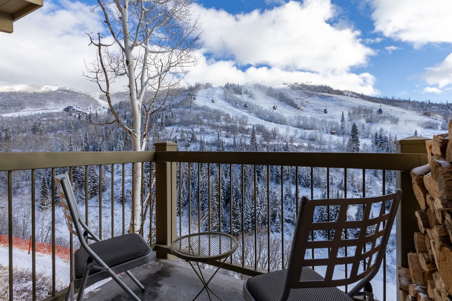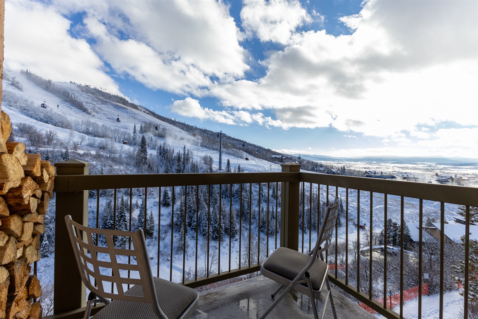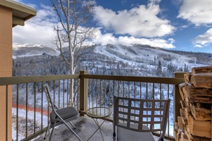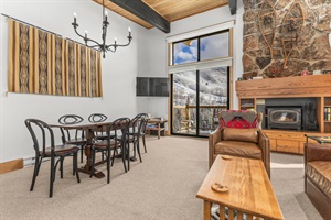 Unwind in the open-concept living room, where expansive ski mountain views fill the space through large windows. Cozy up by the wood-burning fireplace—with firewood provided—or step onto the private balcony to breathe in the crisp alpine air.