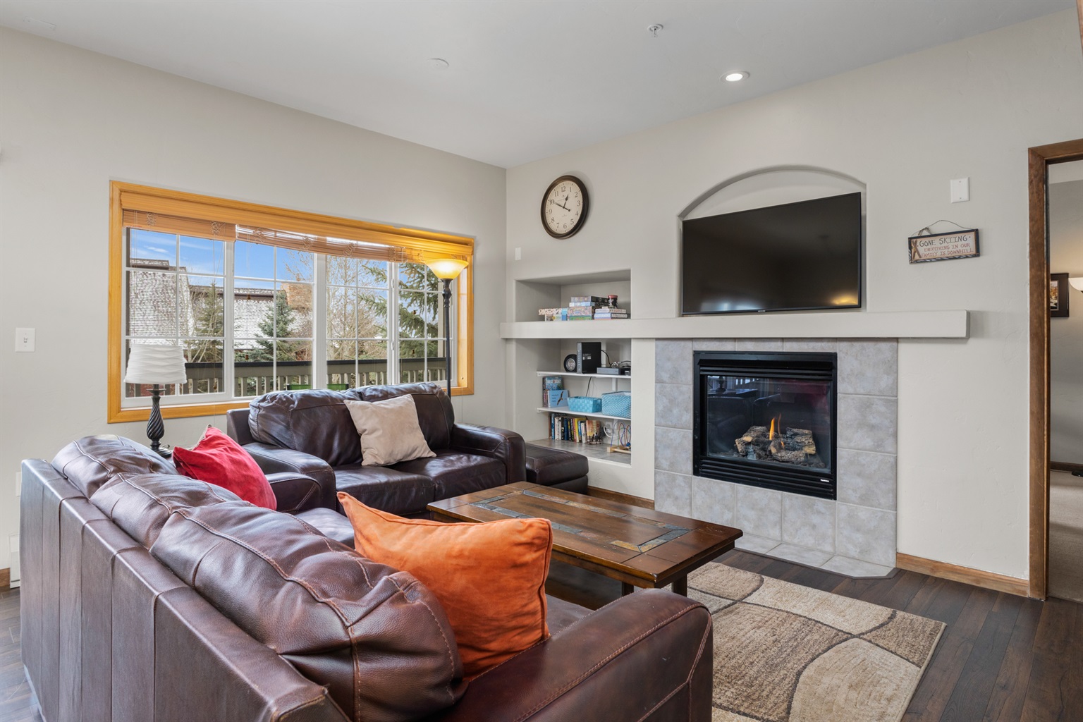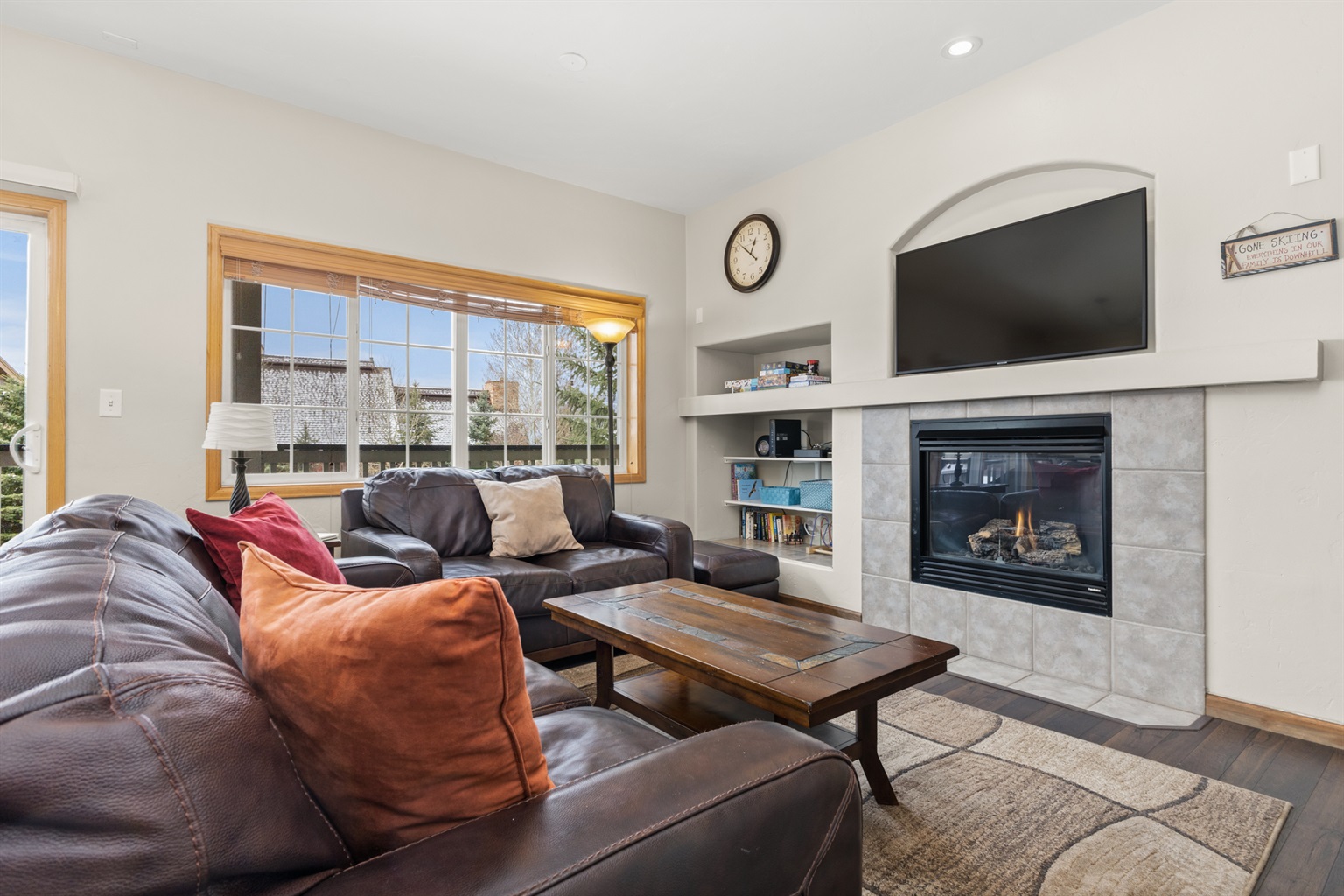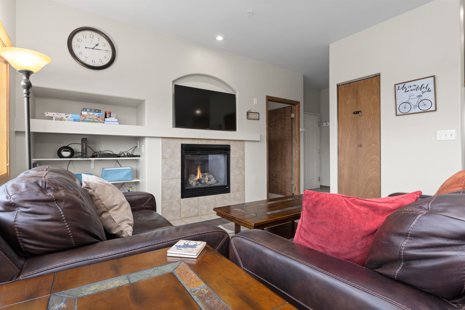 Living Room -- HDTV, Gas Fireplace & Cozy Leather Couch