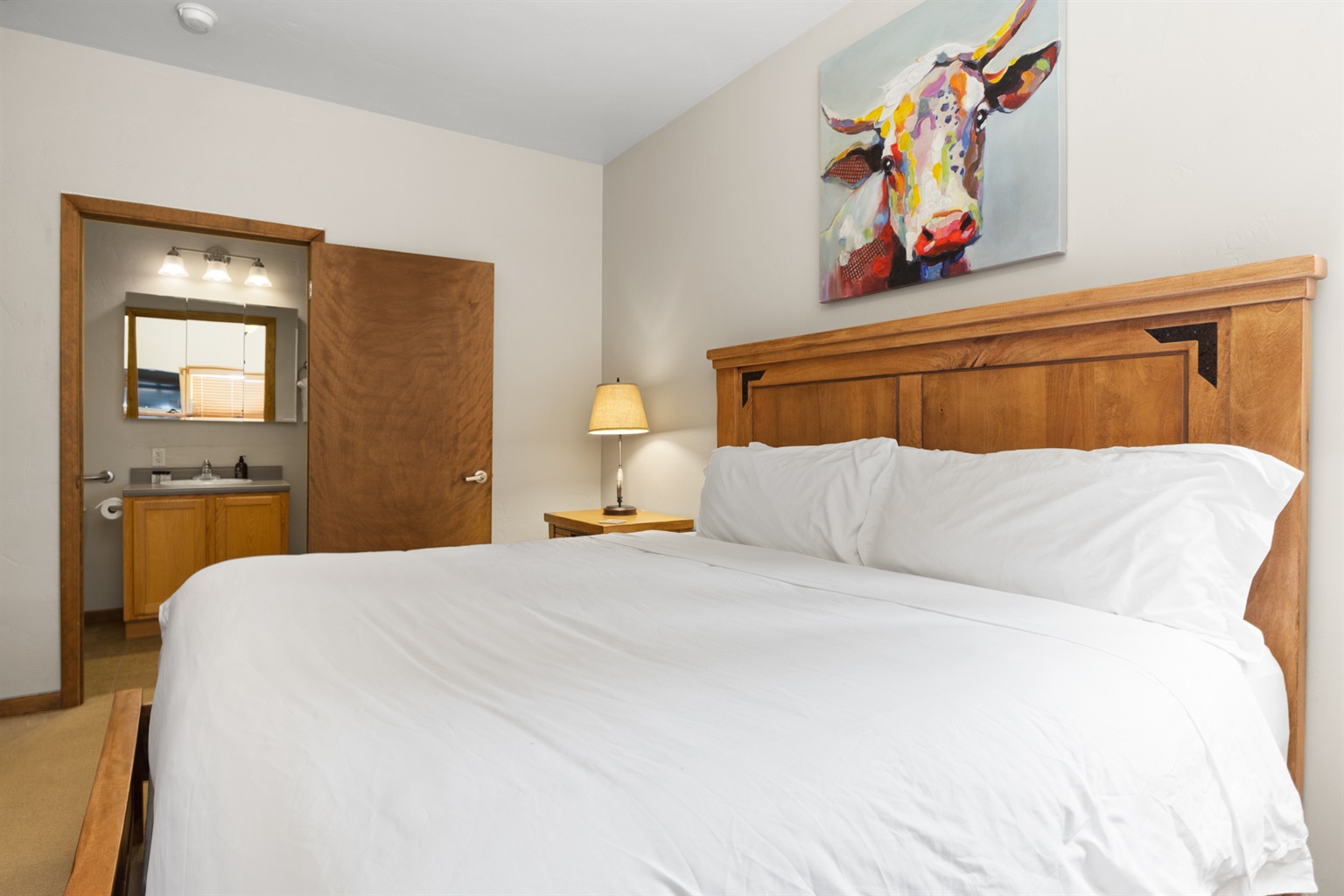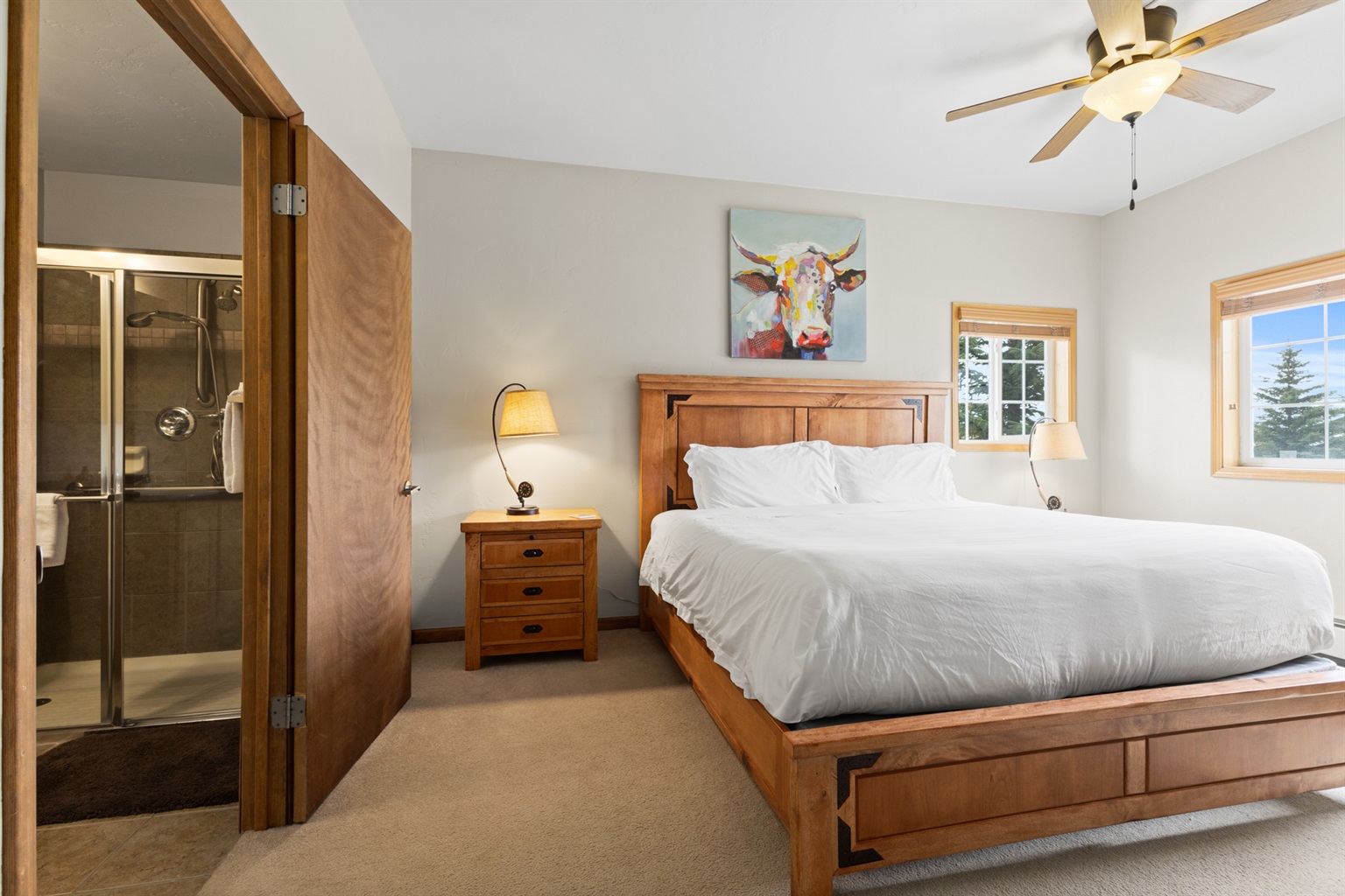 Ensuite Bedroom #1 – King Bed, HDTV, Ceiling Fan, A/C Unit, Ensuite Bathroom (Shower with rails & bench)
